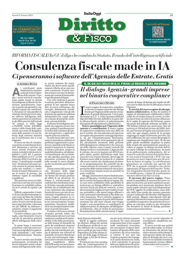 👉Buongiorno collega, nell’articolo di ItaliaOggi del 4 gennaio è uscito alla ribalta il nuovo servizio dell’Agenzia delle Entrate, grazie al quale i contribuenti meno strutturati avranno consulenza gratis tramite i software dell’Agenzia delle Entrate basati sull’ Intelligenza Artificiale!